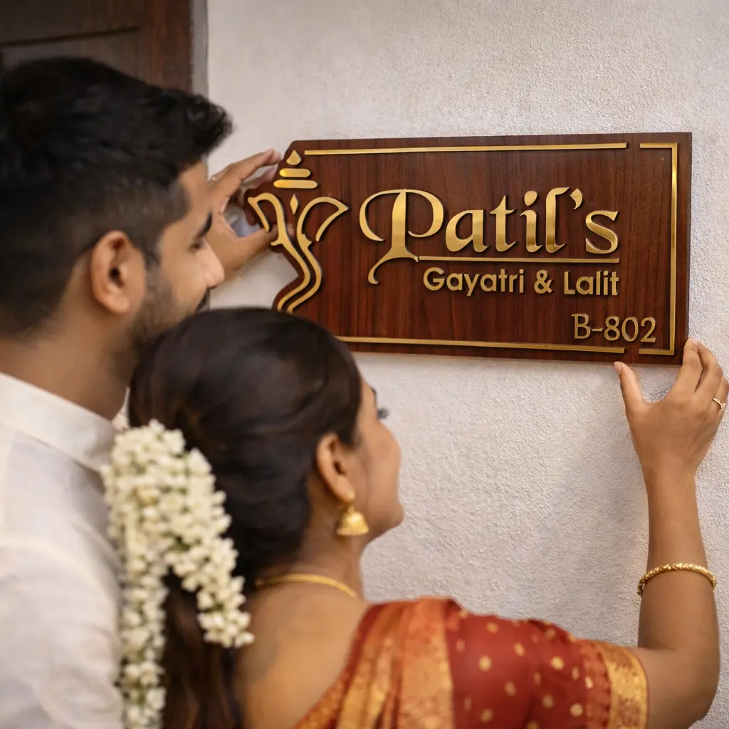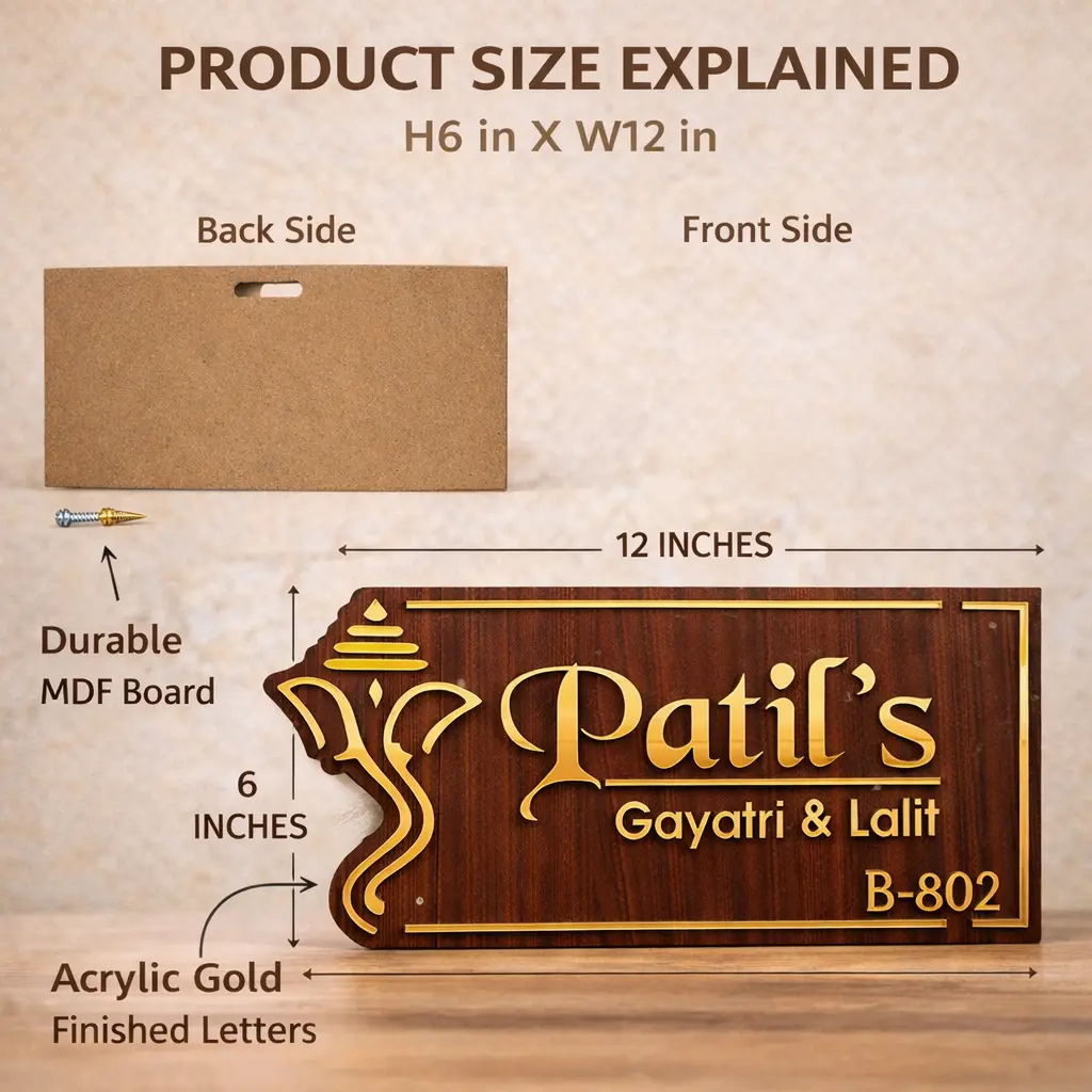 Premium Custom Wooden House Name Plate with elegant Ganesha design and golden acrylic lettering. Perfect personalised name board for home entrance, apartments, villas and offices. ✔ Material: Premium Wooden Base + Golden Acrylic Letters